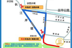 “10公里组”:桃源水乡出发——向西沿江堤至新建水闸——后经过新建水闸沿江堤至崇西水闸(此处设补给点1个)——后沿三绿公路向东至新建公路——沿新建公路向南至新建水闸(此处设补给点1个)——向东沿江堤原路返回桃源水乡结束。